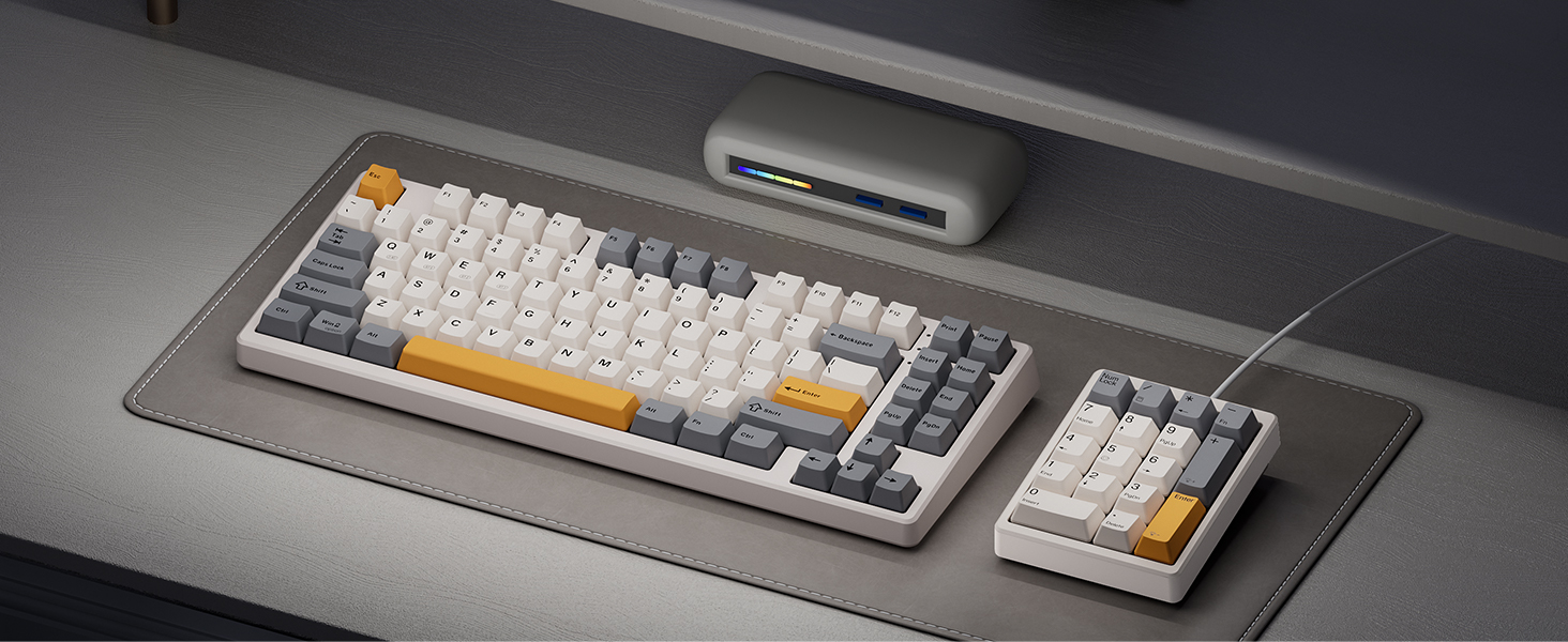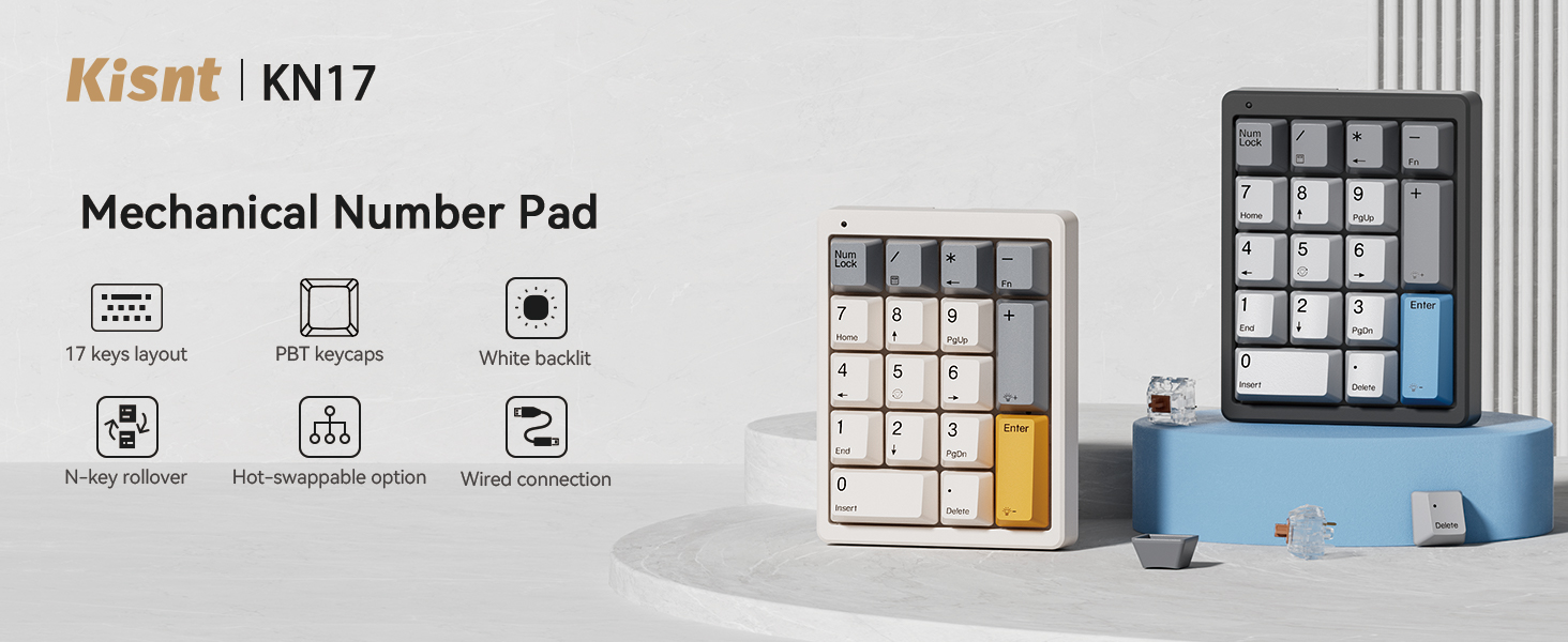 【Unique Mechanical Numeric Keypad Experience】Using a compact keyboard and don't have a number pad for numeric data entry?This Kisnt number pad solves the problem .The idea of having a separate mechanical numeric keypad let you customise your desktop and keep uncluttered.Professional mechanical switch with travel distance ,great tactile feedback,feel sturdy and responsive when in use. 【Ergonomic Design】The stepped keycap and adjustable kickstand provide you with an ergonomic typing experience.Fit your hands easily and relieve fatigue of your wrist. Our number pad also as a great accessory for small laptops without a separate keypad.Unlike a traditional membrane number keypad for laptop,the Kisnt keypad is higher off the desk than the low profile keyboards most business computers come with.If you are sensitive to height, please check our height information carefully. 【PBT Dye-Sub Keycaps&White Backlit Effects】Instead of ABS keycaps ,the 10 key usb keypad go with a Dye Sublimation process and from extra thick PBT for great readability and pleasant touch. The material is extra durable to increase longevity and make the keycaps fade resistant.White backlit effects with most keyboards to meet your different needs .There are 6 light-up modes and 6 levels of brightness for choice.Please note: the lights are not visible through the keycaps. 【Standard 17 Keys Layout Numpad】With compact layout ,this 10 key usb keypad has 17 independent keys including standard numeric 0 key and + key,it won't change your usage habits.Mini size numeric keypad takes little space,the portable design with a detachable USB-C cable meets your needs to typing anywhere and then just put away in a drawer when you don't need to use it. 【Widely Compatible】The mechanical number pad widely compatible with your computer or laptop and other keyboards without numeric section. Compatible with almost all operating systems with Windows Mac,OS, Android. ( NOTE: The 10-key is not compatible with ChromeBook. And not fully compatible with Mac OS. Because Apple products do not support external function keys / buttons)