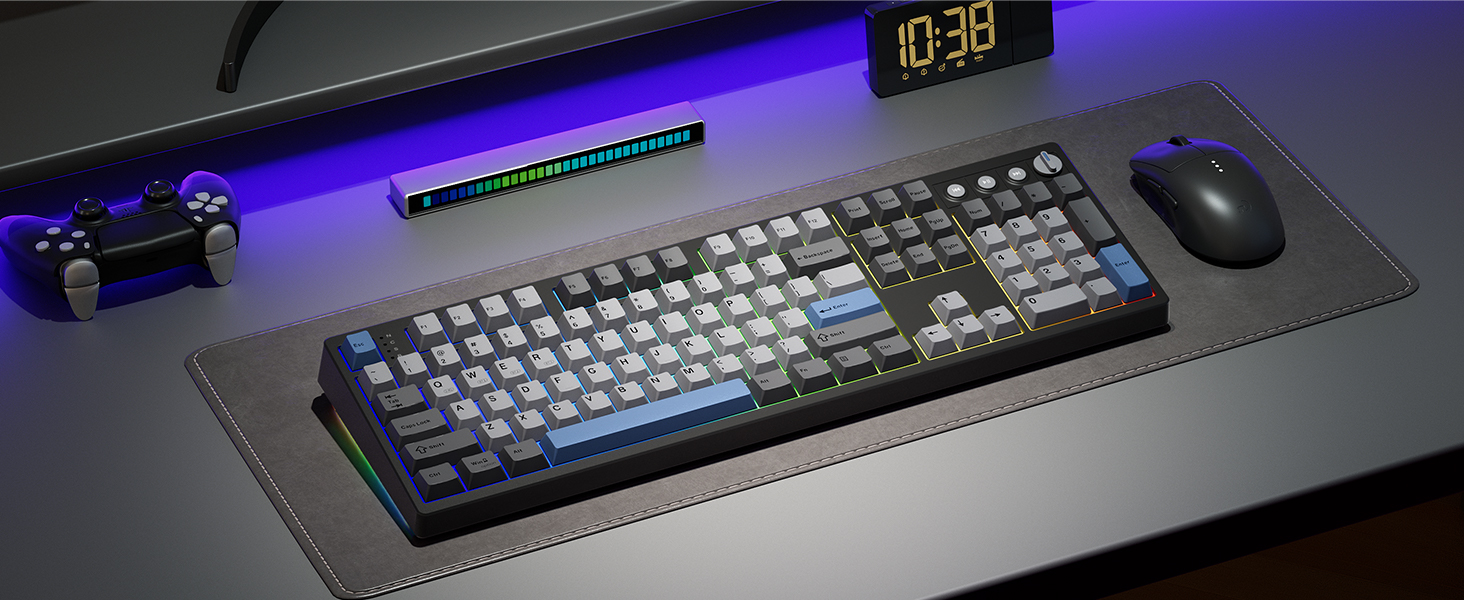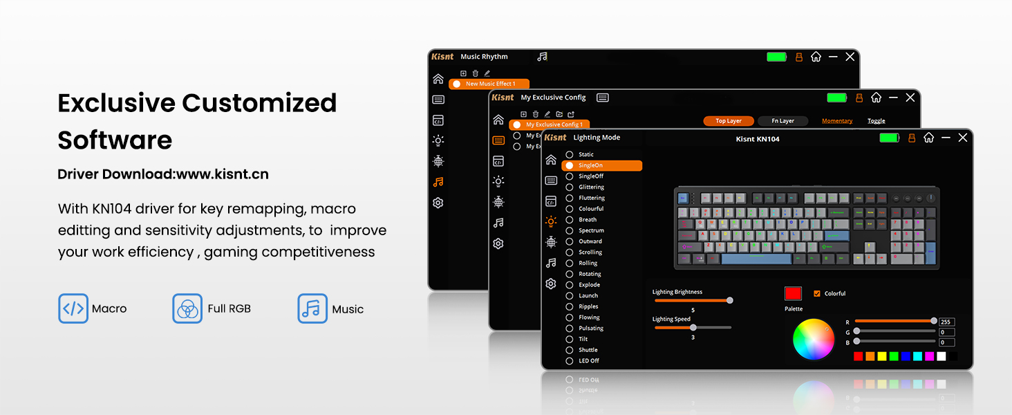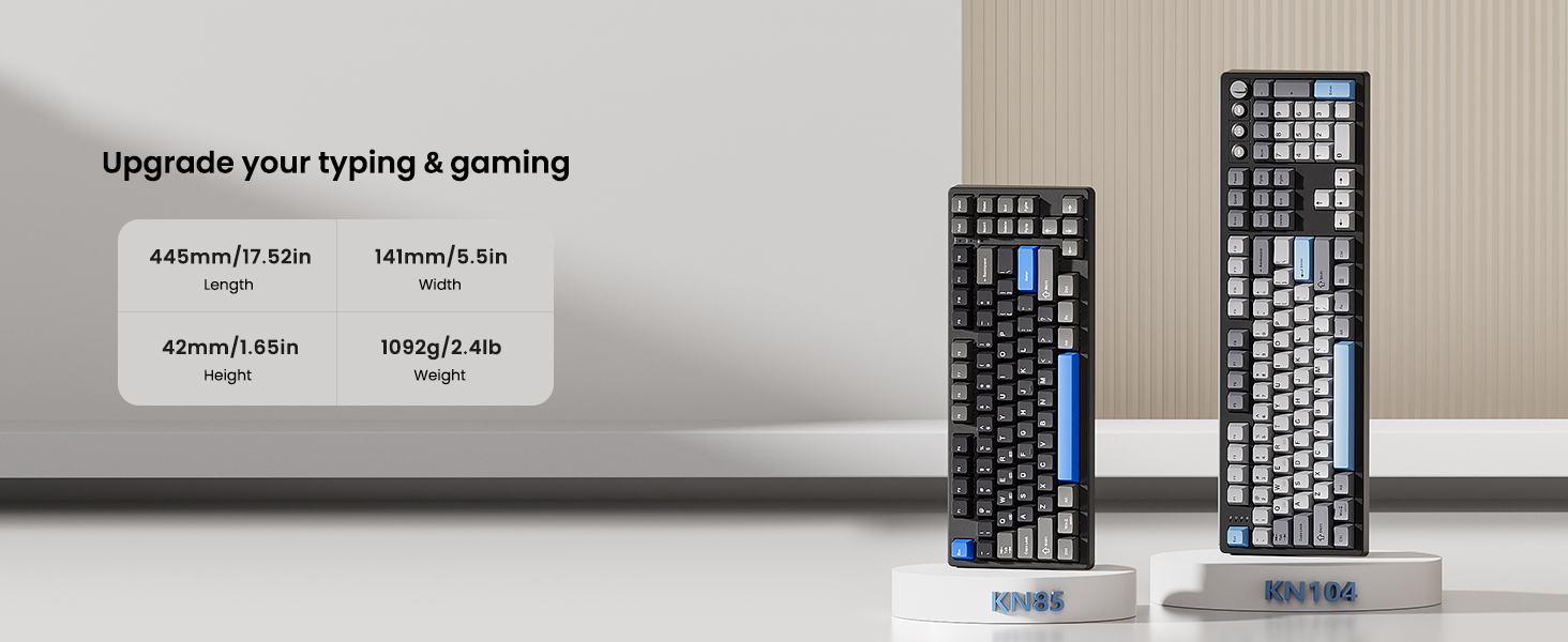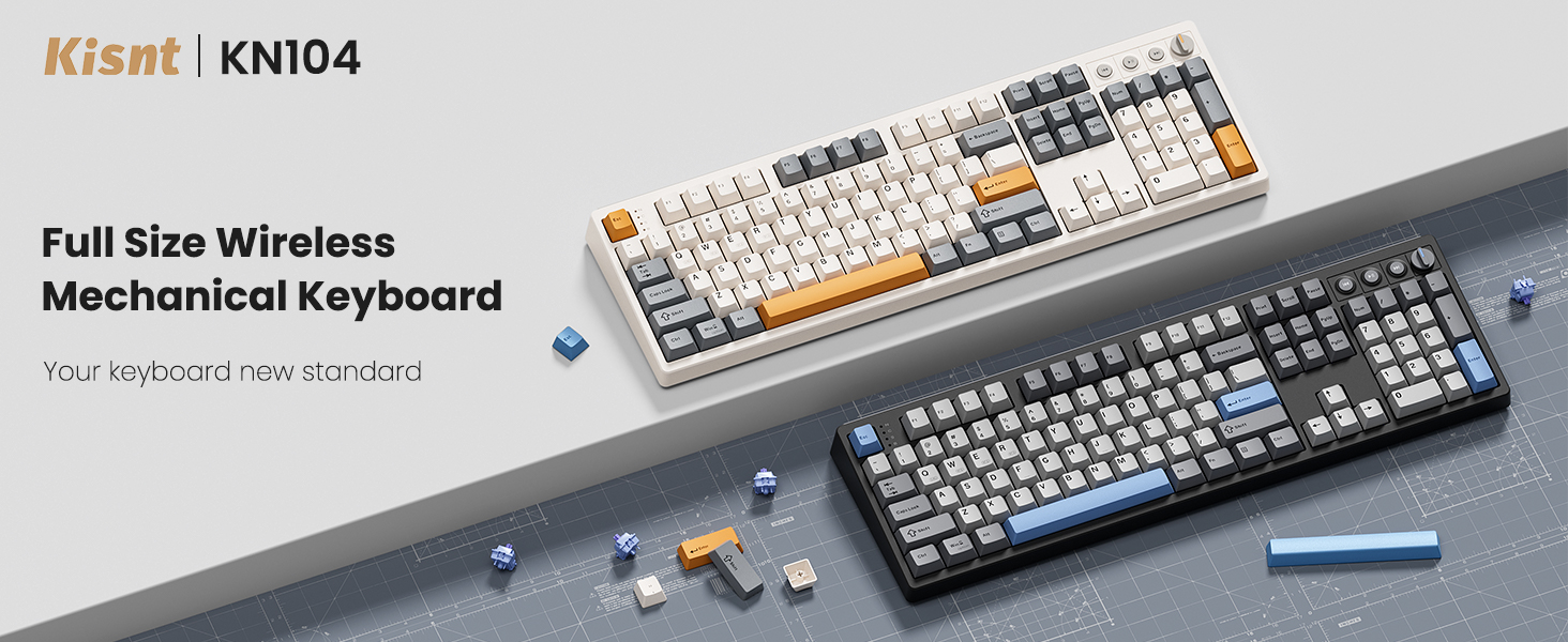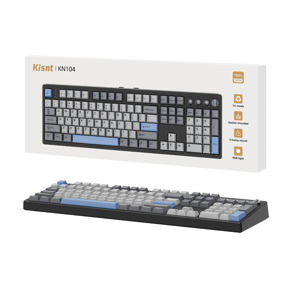 【Inspiration of KN104】Expanding from 75% compact to 100% full size, Kisnt has always been committed to meet your diverse usage needs. The KN104 mechanical keyboard retains the same premium sound and performance as KN85, while upgraded standard 104 keys layout with dedicated knob and four media keys, which is handy for volume or brightness control. It would be larger than what you are used to, but every bit of that extra real estate earns all maximize your daily productivity. 【Wireless Connectivity with Limitless Compatibility】 The gaming keyboard works the way you'd expect for wired (USB-C, also used for charging), 2.4G with a dongle (stored in bottom slot when not in use), Bluetooth (3 devices supported, like most BT keyboards). By offering all three modes of connection, allows you to switch between convenience and stability depending on your needs. The 4000mAh rechargeable battery life lasts for days on a full charge, so you won’t need to worry about constantly recharging it. 【Reunited with Kisnt’s Creamy】Designed with your comfort in mind, this gasket keyboard absorbing sound effectively. Enhanced with a silicone plate and base dampener, five layers of sound-dampening foam, the keys are just the right combination of clicky and clacky, even the space bar and other larger keys without being overly loud or hollow! It's the kind of sound that makes people around you comment " how nice it is "and generates interest in mechs, instead of "what‘s wrong with your keyboard?" The feeling will have you never back to a regular keyboard again. 【Hot-swappable Custom Keyboard】Have fun customizing the acoustic performance and typing feel to your own preference. Hot-swap PCB allows you to replace 3 pins/5 pins switches freely without a soldering issue. The typing perception is buttery smooth thanks to the pre-lubed Bsun linear switches. The black scheme provides a classic and versatile look. Whether you want calm or focused, it makes your office corner feel like yourself. 【RGB Lighting and Programmable】The 100% sized keyboard has 20 RGB lighting effects, which you can adjust brightness and flow rate. The decorative light bars on both sides are colorful and add a strong gaming atmosphere. Effortlessly create keyboard shortcuts, macros, and customize RGB LED colors through Kisnt dedicated software. Note:The driver only supports windows system in wired/2.4G mode. 【2 Years After-Sales Service】Any quality issues in 2 years? A new one on us. Every quality refinement runs through our research, development, production, marketing, and sales processes. We do everything right to get you obsessed with our keyboards.