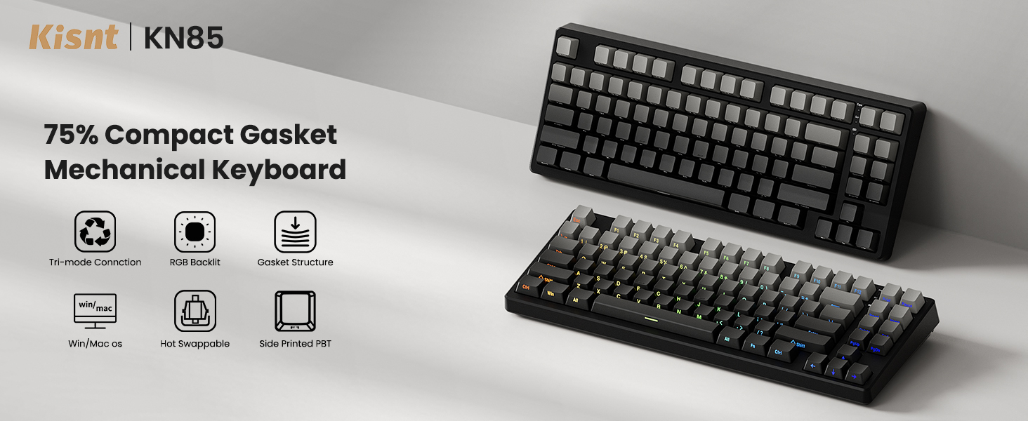 【Connect How You Like】Experience unparalleled versatility with our tri-mode connection gaming keyboard: Bluetooth 5.0, 2.4G wireless and wired USB-C. The wired mode is more efficient and stable, plug and play. Cable-free brings you more convenience, it seamlessly switches between different devices and systems with minimal latency, the wireless mechanical keyboard comes with a robust 4000mAh rechargeable battery, with moderate using, it can last up to a week, making it ideal for extended work or gaming sessions without frequent charging. 【Incredible Typing Experience Starts from Kisnt】Designed with your comfort in mind, the clacky keyboard is absorbing sound effectively. Enhanced with a silicone plate and base dampener, five layers of sound-dampening foam, it delivers a satisfying “thocky” sound. Less hollow sounding, just indulge in pure typing bliss. If you're looking to upgrade from traditional keyboards to a creamy one with every keystroke feel consistent, the Kisnt gasket mounted mechanical keyboard is definitel your best budget choice. 【75% Keyboard Compact Layout】This wired gaming keyboard features an 85-key layout that saves desktop space while retaining essential arrow keys, perfect for anyone seeking to improve your typing and gaming setup.The gradient keycaps with the side-engraved character brings your keyboard an incredibly sleek and clean feel. Whether RGB is off or on, it will be the truly minimalist setups you're looking for. 【Smooth Linear Switches & Hot Swappable】Equipped with pre-lubed Bsun linear switches, Kisnt custom keyboard ensures a creamier and smoother typing experience. Best of all the switches are hot swappable with either 5-pin or 3-pin options, even beginners can easily DIY your own keyboards without soldering issue. Typing on this hot-swap keyboard, it actually makes you want to be at your work station! 【Shine Through Keycaps and Programmable】The Bluetooth keyboard has 20 RGB lighting effects, which you can adjust brightness and flow rate. The passthrough letters make it easier to read the keys in the dark. Effortlessly create keyboard shortcuts, macros, and customize RGB LED colors through Kisnt dedicated software. Note:The driver only supports windows system in wired/2.4G mode. 【2 Years After-Sales Service】Any quality issues in 2 years? A new one on us. Every quality refinement runs through our research, development, production, marketing, and sales processes. We do everything right to get you obsessed with our keyboards. 【First-Time Setup】 The battery comes partially charged for safety during shipping. For the best battery life and performance, please fully charge the keyboard before first use.